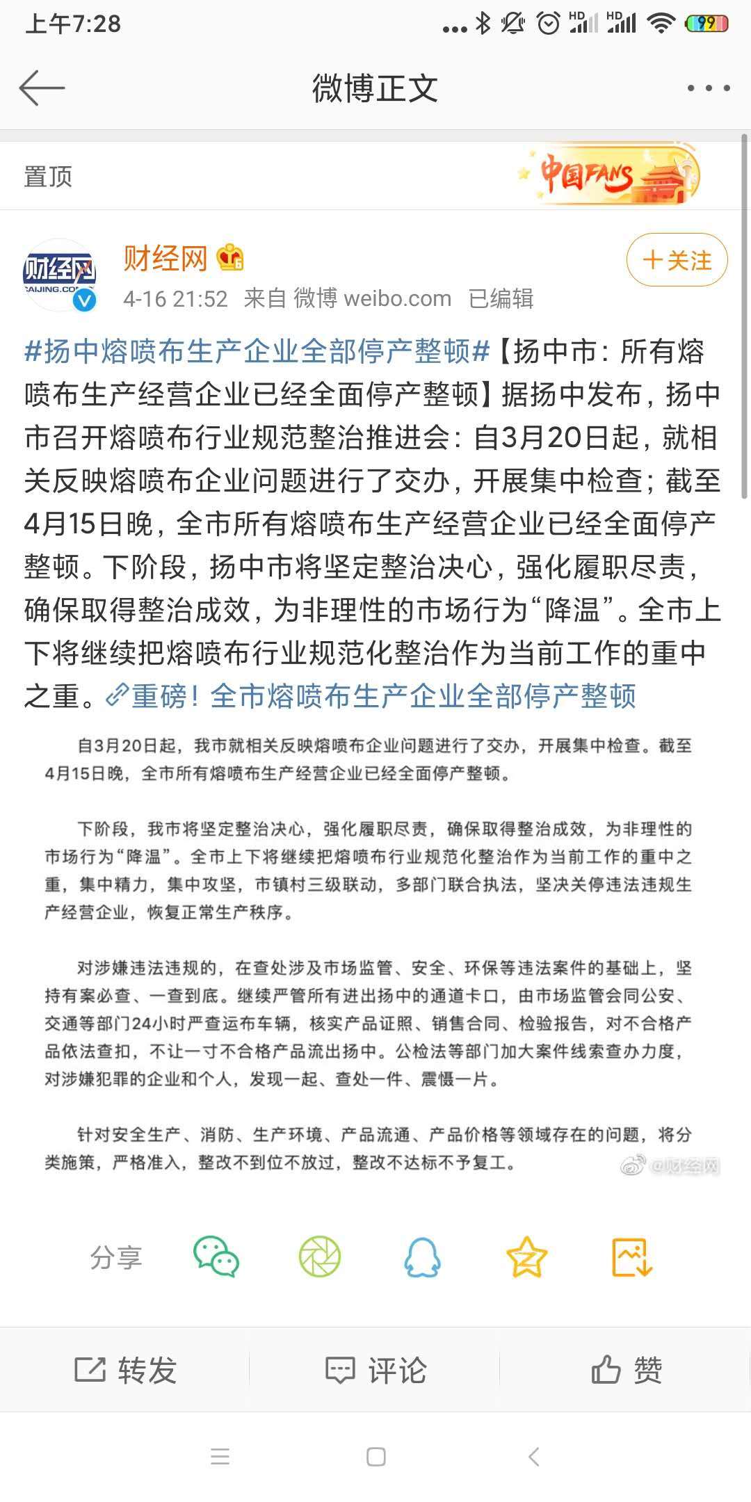 4月15日,经扬中市委、市政府研究决定,在全市范围内实行熔喷布行业“休克”疗法,熔喷布生产企业、个体工商户一律停产整顿,直至产品符合相关质量标准、生产环境设施满足安全环保要求,再经审批方可重新开工,对经审查无法整顿到位或不具备生产经营条件的,坚决予以关停、取缔。28多多风机从客户处得知,整顿的消息出来后,个别小作坊已经开始甩卖生产线了,还有的开始向内地转移生产线,但暴利之下,只能让市场来调节,整顿产量下来了,可能会出现越整顿越涨价的情况。