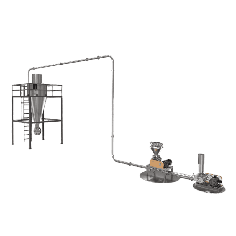 当输送管道内气体压力低于大气压力时,称为吸送式气力输送即负压输送。当风机启动后,管道内达到一定的真空度时,大气中的空气便携带着物料由吸嘴进入管道,并沿管道被输送到卸料端的分离器。在分离器中,物料和空气分离,分离出的物料由分离器底部卸出,而空气通过除尘器除尘后经风机排放到大气中。