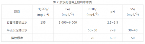 经处理后排水应符合《污水综合排放标准》(GB 8978—1996)中的一级标准,同时考虑远期目标部分指标执行《钛白粉、立德粉工业污染物排放标准》(征求意见稿)中有关要求,要求出水达到pH 6~9、COD < 70 mg/L、SS < 50 mg/L。2