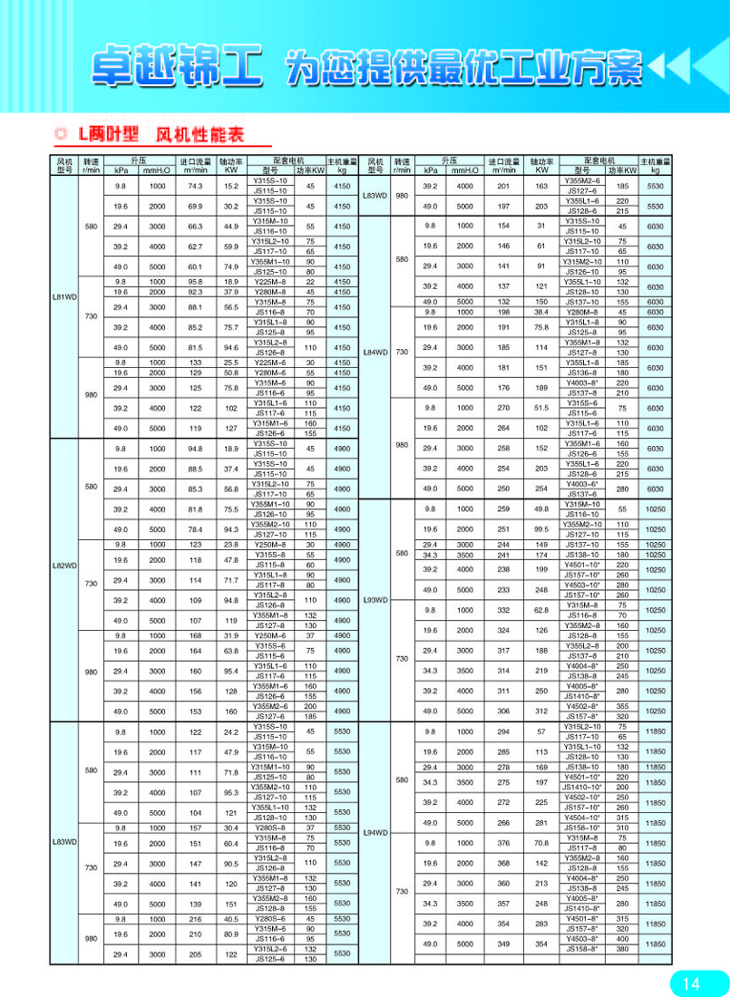 现在市场上的罗茨风机,很少再见到两叶罗茨风机了,现存两叶罗茨风机全是大风量的,基本上都被三叶罗茨鼓风机代替。但是在大流量条件下,两叶罗茨风机还是有市场的,附两叶罗茨风机参数表: