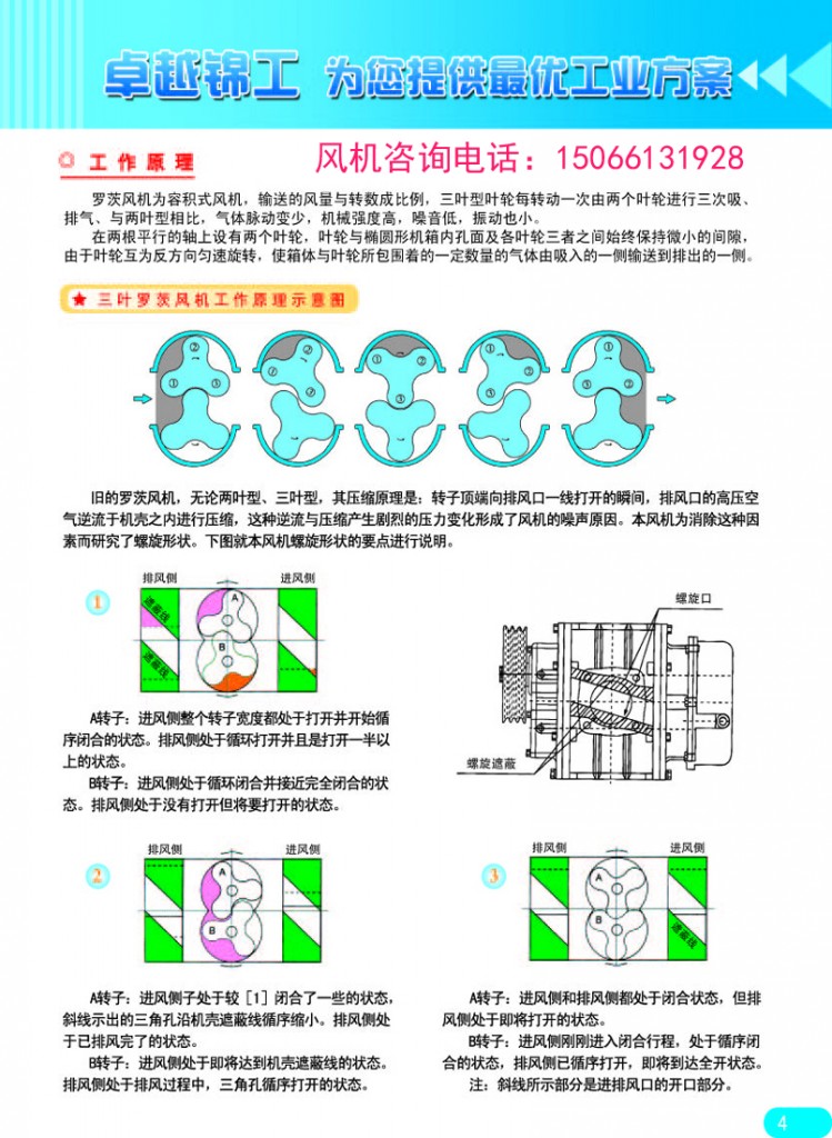 罗茨鼓风机属于容积式风机,输送的风量与转数成比例, 三叶罗茨鼓风机原理是:三叶型叶轮每转动一次由 2 个叶轮进行 3 次吸、排气,与二叶型相比,气体脉动变少,负荷变化小,机械强度高,噪声低,振动也小。在 2 根平相行的轴上设有 2 个三叶型叶轮,轮与椭圆形机箱内孔面及各叶轮三者之间始终保持微小的间隙,由于叶轮互为反方向匀速旋转, 使箱体和叶轮所包围着的一定量的气体由吸入的一侧输送 到排出的一侧。各支叶轮始终由同步齿轮保持正确的相位, 不会出现互相碰触现象,因而可以高速化,不需要内部润滑, 而且结构简单,运转平稳,性能稳定,适应多种用途,已运用于广泛的领域。2什么是罗茨风机