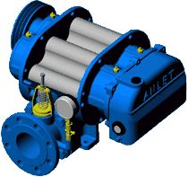 罗茨鼓风机分卧式28多多式两种。卧式罗茨鼓风机,它由两个渐开腰形转子(空心或实心)、长圆形机壳、两根平行轴组成。机壳可分为带有水冷、气冷和不设冷却装置三类。传动机构是在两轴的同端装有式样和大小完全相同的、且互相啮合的两个齿轮,使主动轴直接与电动机相连,并通过齿轮带动使从动轴作相反方向的转动。每个转子旋转一周,能排挤出两倍阴影体积的空气,因而主动轴每旋转一周就排挤出 4 倍阴影体积的空气。罗茨鼓风机进、出口合理的布置应为:上端进风下端排风(对卧式而言),这样可以利用高压气体抵销一部分转子与轴的重力,降低轴承压力,减少磨损。