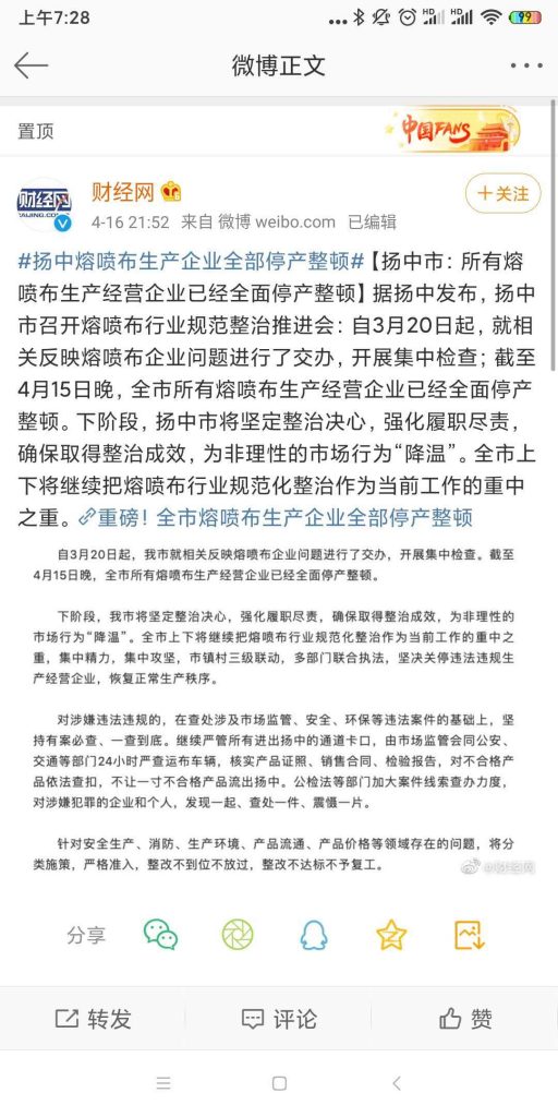 这两天国内部分地区集中整顿熔喷布市场上了热搜,国家已经开始整治熔喷布乱象了,下一步,安评、环评、卫生一卡可能好多小工厂都不能生产了,已经能看到有小作坊甩卖生产线的了,对应的那些手续齐全的将会更加如鱼得水,开始熔喷布整治短期内价格不好降,部分紧缺的还有可能上升,短期内大幅降价几无可能。