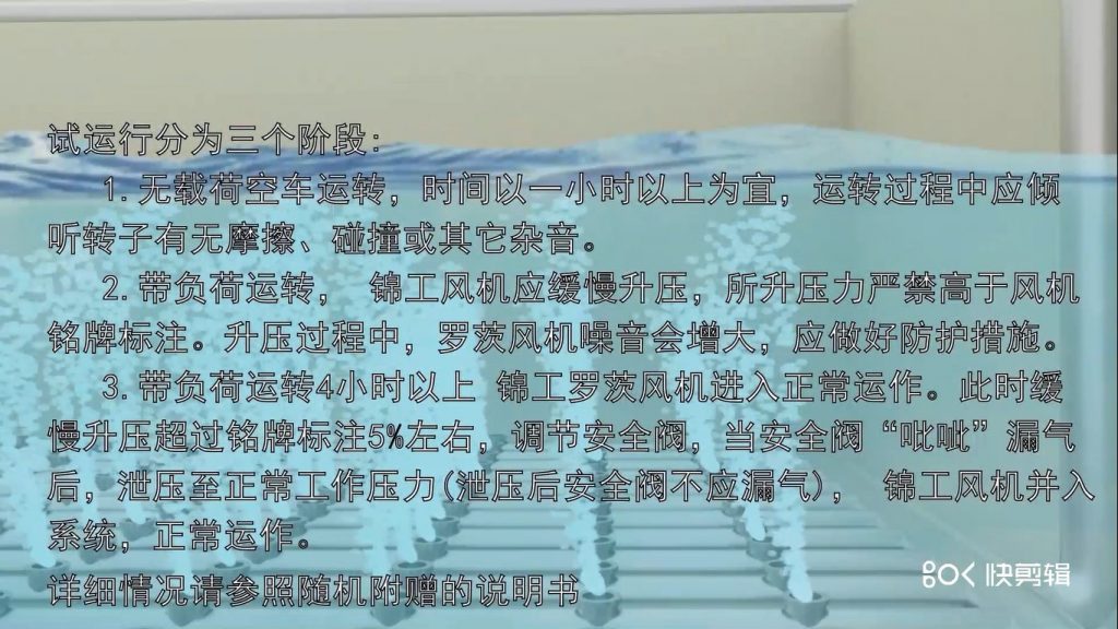 2.带负荷运转, 28多多罗茨风机应缓慢升压,所升压力严禁高于风机铭牌标注。升压过程中,罗茨风机噪音会增大,应做好防护措施。
