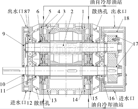 1. 机壳 ; 2. 转子部; 3. 侧板; 4. 隔板; 5. 墙板; 6. 机械密封部; 7. 轴承; 8. 轴承座; 9. 副油箱; 10. 骨架油封; 11. 骨架油封; 12. 油箱密封垫; 13.O 形圈; 14. 侧板密封垫; 15. 墙板密封垫; 16. 轴承; 17 . 齿轮部 ; 18. 齿轮箱 .