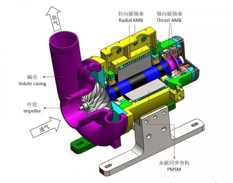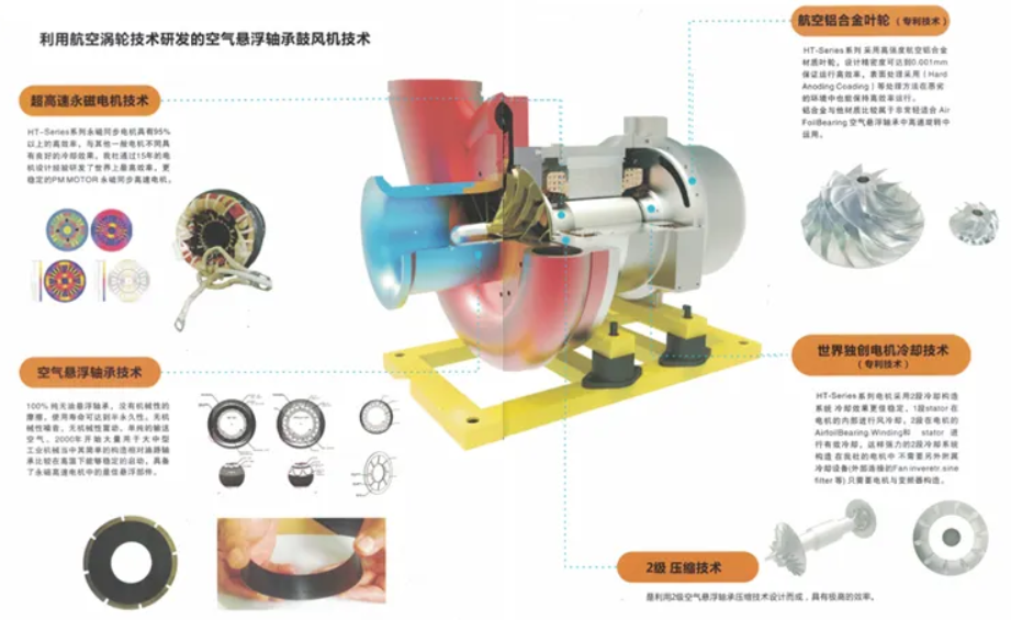 空气悬浮离心鼓风机是一种全新概念的离心鼓风机,借鉴航空、航天器的涡轮发动机,应用先进的空气悬浮技术,采用了“高效永磁电机”和“空气悬浮轴承”这两个高端核心技术,改善了传统单级高速涡轮鼓风机的转速齿轮、联轴器、冷却系统和油润滑系统等,大大提高了产品的技术性能及运行可靠性。避免了噪音、振动以及废弃润滑油等对环境造成的二次污染,大大减少了设备维护工作量,节约了设备维护成本。